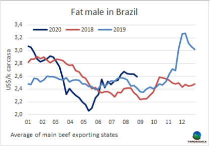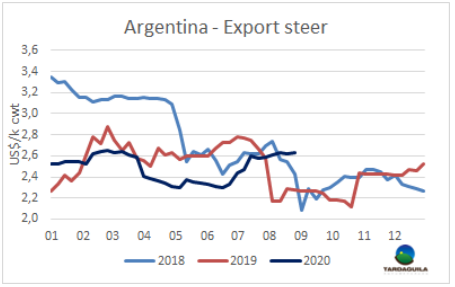 下周猶太屠宰季即將結(jié)束。猶太屠宰季始于6月,在阿根廷外交部和以色列大使館的共同努力下,牛肉加工機構(gòu)設(shè)法將猶太潔食的工作人員從以色列包機帶回。屠宰隊將在猶太新年結(jié)束工作,目前還不清楚他們什么時候能回來。因此,牛犢的貿(mào)易在一個月到一個半月之內(nèi)將退出游戲。這使工廠面臨的情況更加復雜,閹牛價格上漲,國內(nèi)市場低迷,希爾頓配額價格由于新冠疫情的再次出現(xiàn)和需求的疲軟而下跌,美國配額用盡,中國市場僅有貨值低的部位需求且價格上漲緩慢。