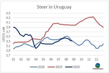 截止8月20日的一周,在屠宰量和各牛種的分布上屠宰量水平與前一周相當。烏拉圭肉協(xié)報告,上周合規(guī)屠宰場活牛屠宰量38527頭,較上周增長了65頭,同比去年同期的屠宰量4.3萬頭下降了10%。屠宰場繼續(xù)481配額的屠宰,這也反應了屠宰的構(gòu)成,與上周相同,其中閹牛屠宰量21478頭,占55.7%,小母牛屠宰量7335頭,占19%,母牛屠宰量9262頭,占24%。屠宰量最高的工廠是Marfrig-Tacuarembo(4596頭),Las Piedras(4339頭),NH-BPU(3976頭)。Marfrig三家工廠屠宰總量11023頭,較前一周增長了10874頭。八月截止22日屠宰量114992頭,同比下降了9.3%,八月屠宰量預計在15萬頭多一些,與2019年八月17.8萬頭相差較遠。