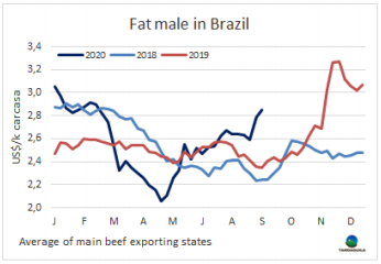 供應(yīng)短缺繼續(xù)籠罩活牛市場,因此本周牛價(jià)再次上漲,昨天巴西主要出口州育成牛價(jià)格上漲至229.4雷亞爾/15公斤,較四月下半月開始上漲時(shí)上漲了27%。除圣保羅以外的地區(qū)預(yù)定期限都很短,大約在六天。批發(fā)市場后部位肉價(jià)格繼續(xù)上漲,前部位肉可能由于出口到中東市場有困難,價(jià)格稍有平衡。