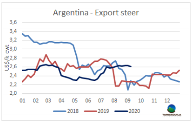 智利牛肉旺季(也就是九月國慶節(jié)假日)開始前的一周,巴拉圭的發(fā)運(yùn)有一些延誤。由于疫情防控采取了隔離措施,目前尚不清楚需求量會有多大。牛肉消費(fèi)量下降,豬肉和家禽等價(jià)格更低的蛋白質(zhì)占據(jù)了智利市場。