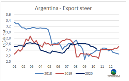 新冠肺炎在幾個(gè)歐洲城市的爆發(fā)以及重新實(shí)行禁令,給在假期旺季出口到歐洲的冷凍牛肉的生產(chǎn)帶來(lái)了不確定性。一些已經(jīng)為這一時(shí)期銷售生產(chǎn)完畢的阿根廷工廠不得不接受9000-9500美元/噸的價(jià)格,以減輕庫(kù)存。也有一些阿根廷工廠不愿以低于9500-10000美元/噸的價(jià)格成交。烏拉圭方面貿(mào)易商稱本周初最高成交價(jià)9000美元/噸,但這一價(jià)格是否能堅(jiān)持仍取決于阿根廷的市場(chǎng)走向。一位貿(mào)易商總結(jié),目前的情況復(fù)雜,因?yàn)槭袌?chǎng)上有庫(kù)存,凍品很充足,沒(méi)有人愿意買。”預(yù)計(jì)自此之后屠宰量的季節(jié)性增長(zhǎng)將導(dǎo)致臀腰肉的供應(yīng)增加。
