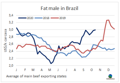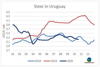 屠宰工廠為出口中國準(zhǔn)備的牛的活牛支付高價(jià)的階段已經(jīng)基本過去了,能滿足春節(jié)需求的船期大多數(shù)都在十一月中旬,很明顯很多出口商已經(jīng)完成銷售。圣保羅育成牛成交價(jià)261-265雷亞爾/15公斤,較上周上漲了3雷亞爾/15公斤。本周初市場較為平靜,可能是由于預(yù)期國內(nèi)需求將在本月下半月趨于平靜。盡管大部分地區(qū)牛家有所上漲,但米內(nèi)羅三角和戈亞尼亞等地區(qū)的牛價(jià)上周沒有發(fā)生變化。烏拉圭