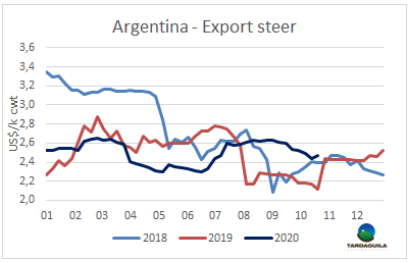 盡管歐洲市場由于疫情爆發(fā)價(jià)格下跌,最好的閹牛價(jià)格回到了兩周前的水平。最好的英國純種閹牛目前成交在188-193比索/公斤。印度串種閹牛185-190美元/噸。特優(yōu)母牛價(jià)格與上周持平,170-178比索。工業(yè)母牛價(jià)格繼上周上漲了14比索后又上漲了5比索,目前價(jià)格在160-165比索。