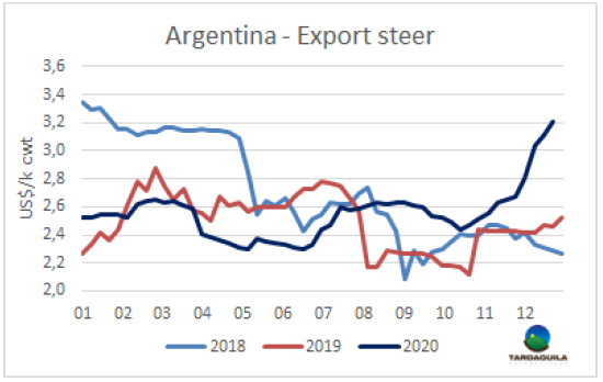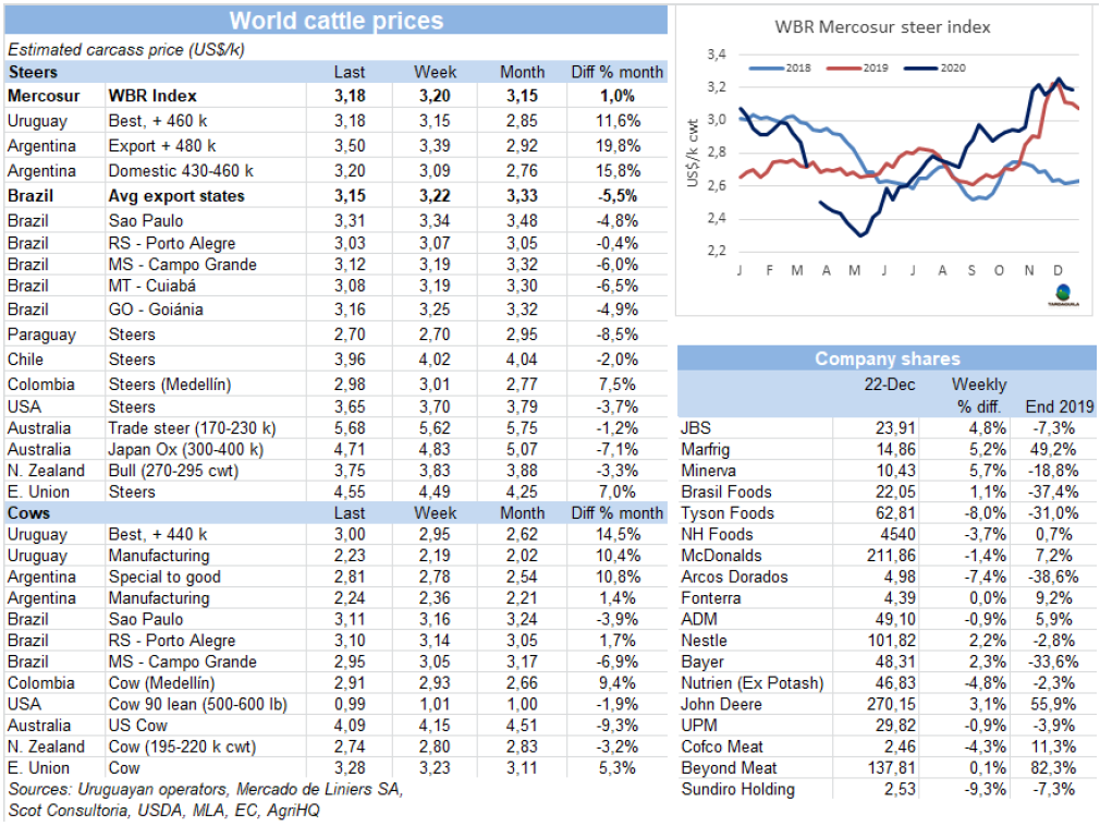 在活牛價格飆高、出口市場價格低迷的背景下,至少有六家工廠決定暫停圣誕節(jié)到1月4日的屠宰活動,這些工廠包括Swift,Gorina,ArreBeef,SanJorge,Frimsa和Rafaela。暫停屠宰活動有助于維持牛價,對閹牛需求的下降將有助于價格下降,通常也會在1月份發(fā)生,因為生產(chǎn)者的供應(yīng)量將比12月份增多。