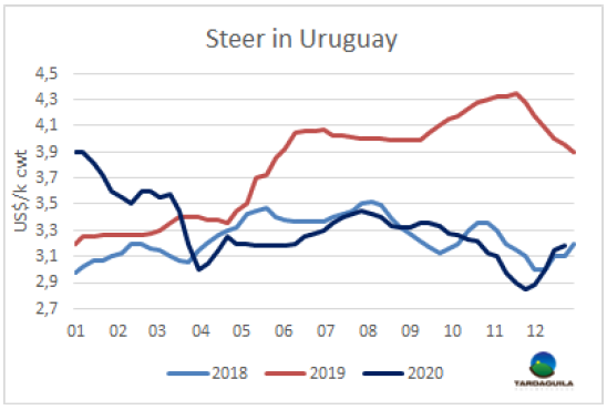 11月平均閹牛類型價值下降至1094美元/頭,較去年12月達到的最高值下降了20%,完全扭轉(zhuǎn)了2019年5月開始的上漲,當(dāng)時非洲豬瘟疫情在中國的影響開始充分體現(xiàn)。與10月數(shù)據(jù)相比,閹牛類型價值下降了3美元/頭。烏拉圭肉協(xié)稱,該數(shù)字的下降似是由于出口部位肉價格的下跌和國內(nèi)市場胴體價格的下跌。雜碎和副產(chǎn)品價格保持穩(wěn)定。鮮皮價格較10月有所上漲。閹牛采購價格也有下降,平均每頭僅下降了9美元。烏拉圭肉協(xié)稱工業(yè)附加值收縮了25美元至211美元/頭。