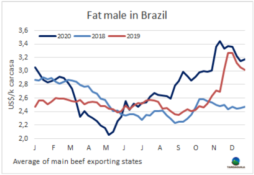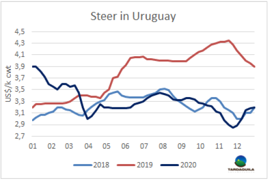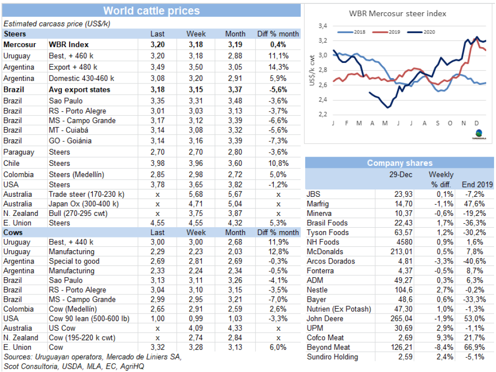 本周南方共同市場閹牛價格以上漲結(jié)束了2020年的走勢。本周價格上漲了2美分,上漲至3.28美元/公斤,較本年度價格最高點僅相差5美分(12月初時),較5月南美地區(qū)疫情最嚴重時牛價最低點高90美分(39%)。本周南美牛價指數(shù)上漲主要由于巴西和烏拉圭牛價上漲,本周巴西育成牛價格上漲了4雷亞爾,上漲至248雷亞爾/15公斤,結(jié)束了前幾周的下行趨勢,由于雷亞爾貶值,美元價格漲幅較小,美元牛價上漲了3美分至3.18美元/公斤。烏拉圭由于供應(yīng)減少,特種閹牛價格上漲了2 美分,上漲至3.2美元/公斤。阿根廷方面前幾周市場堅挺,本周趨于平穩(wěn),由于阿根廷比索貶值蓋過了本地牛價的上漲,出口閹牛價格下跌了1美分至3.49美元/公斤。巴拉圭市場活牛價格連續(xù)第三周保持平穩(wěn),保持2.7美元/公斤。