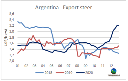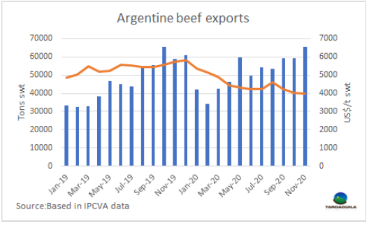 根據(jù)阿根廷牛肉推廣局發(fā)布的報告,11月冰鮮牛肉、冷凍牛肉及其加工產(chǎn)品出口量總計65757噸,達十年以來最大,出口額達2.616億美元。這些數(shù)字意味著出口量與2019年11月相比增長11.4%,出口額下降了22.6%。該差異產(chǎn)生的原因是11月平均出口價格較去年同期降低了30.5%,11月冰鮮去骨牛肉平均出口價格達近6250美元/噸。冷凍去骨牛肉平均價格4000美元/噸,同比分別下跌了22.7%和27.4%。平均出口價值自2009年以來首次降至每噸4000美元以下,達整個南美地區(qū)最低。市場分析師Ignacio Iriarte告訴記者,以同等胴體重量計算的月出口量和年出口量記錄是90多年來最高的。