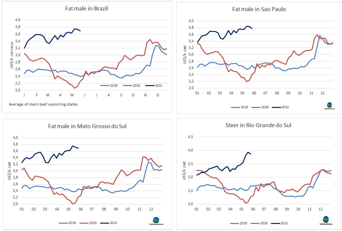 自2018年七月起,巴西牛肉月出口量連續(xù)34個月超過10萬噸。在此之前,月出口量超過10萬噸連續(xù)最長的階段是自2006年5月至2007年6月的連續(xù)14個月。據(jù)分析,這是強(qiáng)勁的國際市場需求所導(dǎo)致的,尤其是來自中國的需求。巴西的產(chǎn)能無法跟上日益增長的需求,帶來的結(jié)果則是待宰牛、架子牛和國內(nèi)市場牛肉價格的持續(xù)上漲。2018年7月育肥牛平均價格209雷亞爾/15公斤,2018年年末育肥牛價格上漲至219雷亞爾/15公斤。2019年年初育肥牛參考價220雷亞爾/15公斤,2020年育肥牛價格達(dá)300雷亞爾/15公斤。2021年前5個月育肥牛價格達(dá)310雷亞爾/15公斤,今年年底到期的期貨合約價格將達(dá)約330雷亞爾/15公斤。