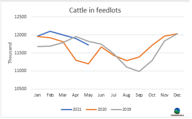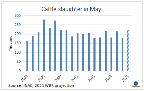 上周牛屠宰量再次增長,烏拉圭肉協(xié)報(bào)告統(tǒng)計(jì),上周屠宰量55712頭,較前一周增長了2000多頭,達(dá)今年周屠宰量的第二高。較去年同期增長了超過10000頭。隨著歐洲481配額的生產(chǎn)全面打開,閹牛屠宰量達(dá)29938頭,達(dá)2018年3月第三周至今三年多以來最大,同樣,小母牛屠宰量達(dá)6263頭,達(dá)3月第一周以來最大。相反,母牛屠宰量下降至18598頭,較上周下降了2432頭。屠宰量最大的工廠是Athena-Pulsa(4956頭),Las piedras(4532頭),Athena-Canelones(4476頭)。本周Athena三家工廠屠宰總量13639頭,Marfrig四家工廠屠宰總量13772頭,日資企業(yè)BPU上周五進(jìn)行了最后一次屠宰活動,本周暫未開始屠宰,還在等待中國市場的重新準(zhǔn)入。截止5月22日,牛屠宰量達(dá)160548頭,較2020年同期增加了15575頭,約增長了20%。如果不出現(xiàn)疫情相關(guān)的重大問題,五月屠宰量將超過22萬頭,達(dá)10年以來最高。 5月也將成為連續(xù)第八個屠宰量高于去年同期的月份。