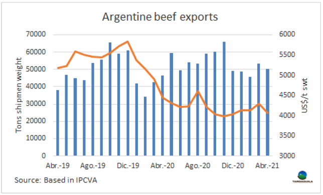 阿根廷政府為控制國內(nèi)肉類價格的上漲實(shí)行了30天的出口禁令,該禁令排除對該國有關(guān)稅配額的出口活動,如希爾頓配額,481配額,美國配額和哥倫比亞配額。對以色列冰鮮產(chǎn)品的出口是否可以排除在外還不能確定。希爾頓配額和481配額代表著絕大多數(shù)牛肉對歐盟的出口量。2021年前四個月,阿根廷對歐洲冰鮮牛肉出口量達(dá)10187噸,出口額達(dá)9010萬美元,481配額出口量1540噸。同一時期阿根廷對美國出口量4427噸,占配額總量的22.7%,出口額2660萬美元。哥倫比亞的配額目前關(guān)聯(lián)不大。因此,被排除的出口量占總出口量的7.4%,由于這些產(chǎn)品的成交價格很高,按美元計(jì)的占比可能更高。除中國市場外,受出口暫停政策影響的市場主要是以色列、智利和巴西。除這些市場之外,目前正在進(jìn)行的發(fā)貨包括上周一(正式知道禁令的那一天)之前簽訂的所有銷售訂單,以及在聲明和該措施生效(周四公布第75號決議)之間登記的銷售訂單。在此期間,許多出口商仍在繼續(xù)進(jìn)行牛肉出口。