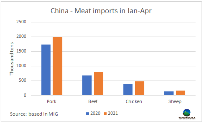 據(jù)梅特國際集團(tuán)發(fā)布的數(shù)據(jù),2021年前四個月中國牛肉進(jìn)口量達(dá)350萬噸,較2020年同期增長了50萬噸,增長了17%。貿(mào)易的增長主要體現(xiàn)在四種主要肉類上。今年年初羊肉產(chǎn)量很低,現(xiàn)在已經(jīng)回升,比去年同期增長了28%,在四個月的時間里增加了17.4萬噸。今年4月,中國進(jìn)口羊肉5.04萬噸,比2020年同月增長了37%。主要進(jìn)口肉類仍是豬肉進(jìn)口量達(dá)200萬噸,同比增長了15%,牛肉進(jìn)口量81.5萬噸,同比增長了19%,雞肉進(jìn)口量48.8萬噸,同比增長了21%。