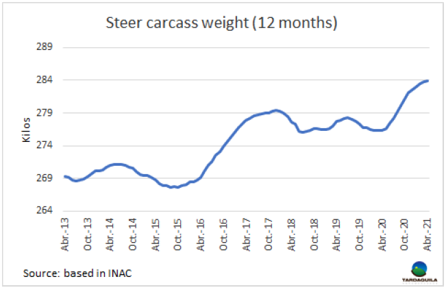 由于出口市場為體重較大的閹牛售價(jià)可觀,閹牛平均胴體重量持續(xù)增長。截止4月烏拉圭肉協(xié)最近一次發(fā)布的數(shù)據(jù)前的12個(gè)月內(nèi)閹牛平均體重283.9公斤,創(chuàng)新紀(jì)錄。截止2020年4月的12個(gè)月內(nèi)閹牛平均體重276.3公斤,今年4月的平均體重增長了7.6公斤。牛肉行業(yè)中體重較大的閹??梢再I上更好的價(jià)錢,因此生產(chǎn)者對(duì)此做出反應(yīng)。在胴體重量上上烏拉圭仍需繼續(xù)努力,在美國等發(fā)達(dá)國家的牛只平均體重更重一些。澳大利亞的公牛和母牛體重繼續(xù)創(chuàng)新紀(jì)錄,第一季度的體重紀(jì)錄分別為341公斤和281公斤。烏拉圭的閹牛體重比澳大利亞輕57公斤,母牛均重較澳大利亞輕45公斤。