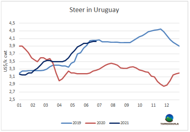 2020年七月至2021年六月,烏拉圭牛屠宰量229萬頭,較上年增長了31萬頭,增長率15.7%。逆轉(zhuǎn)了前一年15.8%的大幅下降。烏拉圭牛肉屠宰量在2019/20年僅不足200萬頭,是六年來的最低水平,但屠宰量迅速復(fù)蘇,因?yàn)檫@種下降的原因不是周期性的保留種群,而是活牛供應(yīng)的減少尤其是閹牛。2017年和2018年大量出口活牛。當(dāng)2018年出生的下一代開始達(dá)到屠宰重量時(shí),屠宰量很快就恢復(fù)了。由于平均體重增長,牛肉產(chǎn)量的增長將超過屠宰量的上漲。據(jù)估算,到2020年7月至 2021年6月,烏拉圭牛肉產(chǎn)量將達(dá)59.3萬噸,年增長超過9萬噸,增長率18.2%。達(dá)在過去九年里是第二高屠宰量, 2016/17年牛屠宰量超240萬頭,牛肉產(chǎn)量60.7萬噸。當(dāng)時(shí)的平均胴體重量為251.9公斤,而今年的胴體均重估計(jì)為259.3公斤,達(dá)歷史最高。