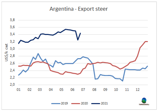 昨天政府宣布了一項(xiàng)新的牛肉出口計(jì)劃。本期牛肉周報(bào)發(fā)表之時(shí),總統(tǒng)令的內(nèi)容(DNU)尚未完全公布,但政府宣布了一般條款,牛肉出口量不得超過2020年出口量的50%,二分體,四分體,和以下其中部位肉禁止出口:肋排、玫瑰肉、牛腩、大米龍,臍橙板、肋排邊、肩胛。下午,出口商表示強(qiáng)烈反對(duì),以至于政府承諾今天為他們舉行一次“澄清會(huì)議”。質(zhì)疑聲包括上個(gè)月被出口禁令豁免的希爾頓481和美國等關(guān)稅配額和以色列市場的出口(其大使上周強(qiáng)烈抗議)是否包含在50%的出口限制中。阿根廷2020年出口牛肉量89.7萬噸,如果配額包含在50%的出口限制以內(nèi),每月可出口牛肉量為37375噸。此外,據(jù)稱,農(nóng)牧漁業(yè)部將在一個(gè)月內(nèi)將推出一個(gè)畜牧計(jì)劃 ,其主要目標(biāo)是提高牛肉產(chǎn)量,超過當(dāng)前的320萬噸,至500萬噸/年。他們正在為此研究的措施,正如生產(chǎn)發(fā)展部部長Matías Kulfas在一次采訪中所說,將實(shí)行包括稅收激勵(lì)、技術(shù)和牧場的軟信貸,以及增加屠宰重量的激勵(lì)措施。政府在會(huì)上表示,當(dāng)國內(nèi)市場牛肉的價(jià)格穩(wěn)定, 可以允許出口量擴(kuò)大,這在一個(gè)的2021年第一季度按年計(jì)通貨膨脹率62%的國家似乎是一個(gè)笑話。鑒于糟糕的經(jīng)濟(jì)形勢和近9萬人死于Covid-19,本屆政府在今年的中期選舉中表現(xiàn)一般,9月將舉行初選,11月將舉行第二輪選舉。最近到來的疫苗將是主要的支撐依據(jù),而“價(jià)格便宜”的肉類似乎是另一支撐。
