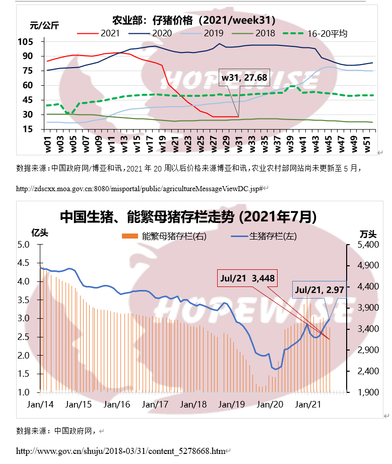 2021年7月全國生豬均價15.71元/kg,環(huán)比上漲7.24%,同比下滑56.98%。白條均價21.49元/kg,環(huán)比上漲7.72%,同比下滑54.25%。7月高溫天氣抑制豬肉消費,屠企開工率低,凍品庫存大,豬肉市場整體呈現(xiàn)供大于求。