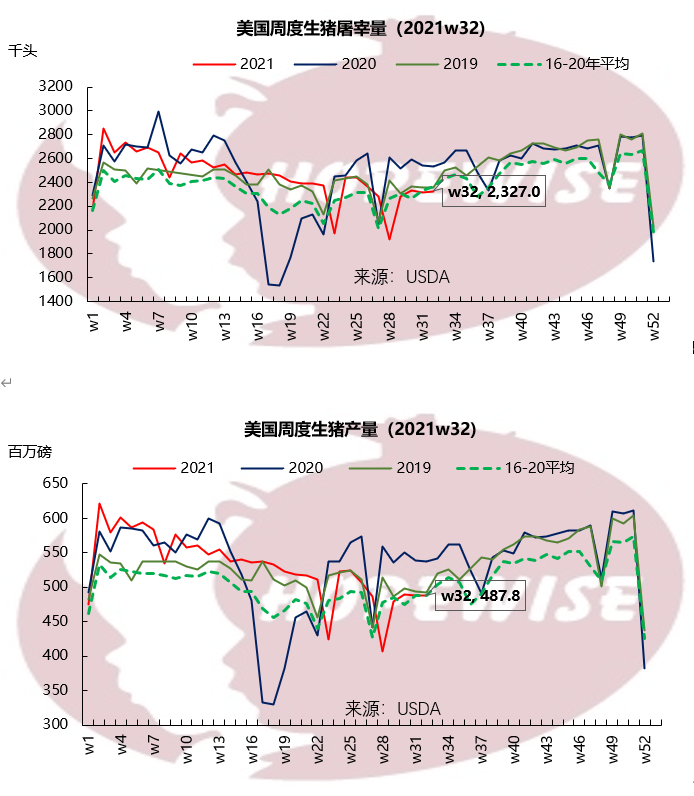 美國7月生豬均價109.10美金/百磅,環(huán)比下滑7.31%,同比上漲229.61%。豬胴體分割品綜合價119美金/百磅,環(huán)比下滑4.72%,同比上漲76.56%。由于屠企缺少工人,生豬價格下滑;而細分割品價格高企,助推豬胴體價格上漲。勞動力短缺成為生豬價格和豬胴體價格存在差異的主要因素。周均屠宰量222.58萬頭,環(huán)比減少3.5%,同比減少9.51%。養(yǎng)殖成本方面,玉米均價6.4美金/蒲式耳,環(huán)比下滑3.03%,同比上漲100%。大豆均價14.6美金/蒲式耳,環(huán)比下滑0.68%,同比上漲62.22%。