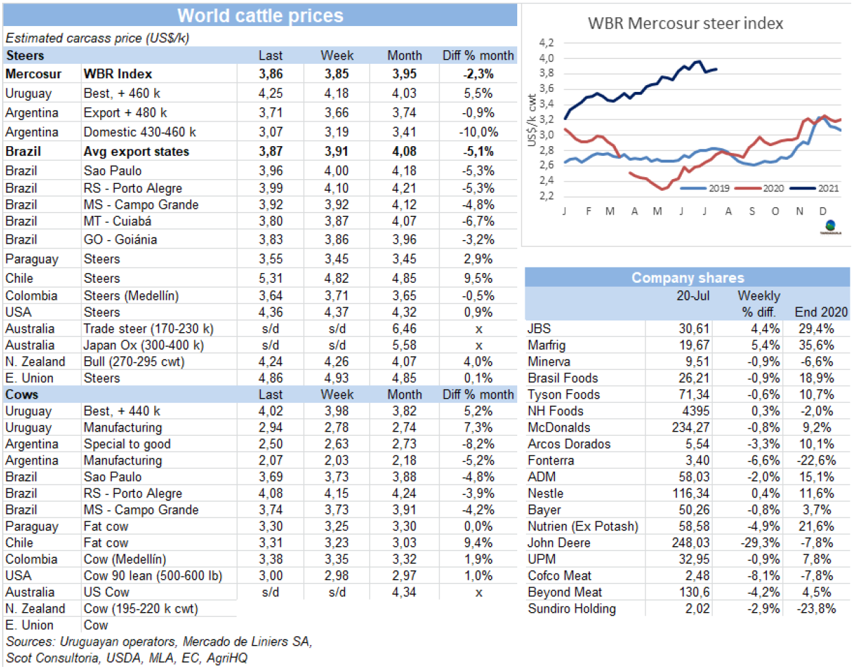 6月閹牛類型價值1261美元/頭,較上月增長了65美元,達2020年1月至今17個月以來的最高。烏拉圭肉協(xié)報告稱本月閹牛類型價值增加的原因是出口部位肉價格上漲和國內(nèi)市場胴體價格、副產(chǎn)品和鮮皮價格上漲。活牛采購價格上漲了37美元/頭,因此兩者的價差工業(yè)增加值增長了29美元至214美元,工業(yè)增加值增長了1.5%至17%,如果價值低于20%,則認為該行業(yè)很難實現(xiàn)正利潤。