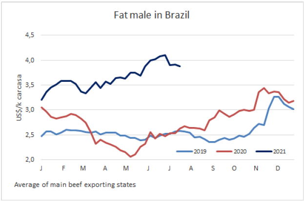 巴西市場無論是牛肉批發(fā)價格還是活牛價格均保持平穩(wěn),育肥牛供應(yīng)增加了一些,需求端更加淡定了一些,巴西國內(nèi)市場需求較弱,成交較少。圣保羅州育肥牛參考價310.5雷亞爾/15公斤,賣到中國的育肥牛成交價320雷亞爾/15公斤。所有牛種的價格都較上周保持不變。本周初從南部地區(qū)向中部蔓延的寒流可能將帶來活牛供應(yīng)的短暫性增多。