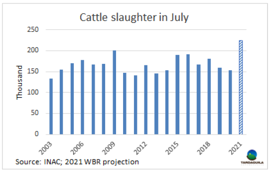 7月前17天,烏拉圭屠宰行業(yè)牛屠宰量達127297頭,較2020年同期增長了4萬頭(46%),據(jù)本月結(jié)束還剩兩周,預(yù)計2021年七月牛屠宰量將達歷年七月最高。截至目前只有兩各年度期月屠宰量超過20萬頭,1982年(歷史上最糟糕的一次經(jīng)濟危機,以所謂的“匯率制度”的崩潰而告終)和1989年,當時烏拉圭經(jīng)歷了嚴重的干旱,這兩年的屠宰量分別達到了20.1萬頭和20.3萬頭。今年如果接下來兩周的周屠宰量保持5萬頭以上,七月屠宰量將達22.5萬頭,將輕松超過以往的屠宰量記錄。記者問詢的工廠都一致認為接下來兩周屠宰量將保持當前節(jié)奏,一些工廠已經(jīng)備足了待宰牛,因此大概率七月屠宰量記錄將會打破。上周,盡管冬季來臨,據(jù)烏拉圭肉協(xié)報告統(tǒng)計,上周牛屠宰量51754頭,較前一周增長了550頭,屠宰量連續(xù)第四周保持五萬頭以上,較去年同期增長了2萬頭以上,(+66%)。本周閹牛屠宰量繼續(xù)減少,母牛屠宰量增長。閹牛屠宰量較上周減少了9%至21398頭,母牛屠宰量增長了9%至22868頭,母牛屠宰量較去年同期有突出的增長。屠宰量最大的工廠是Las Piedras(4475頭),Athena-pulsa(4384頭),Carrasco(4079頭)。Marfrig四家工廠屠宰總量14019頭,較上周下降了700頭, 從這周起,Colonia廠所有員工開始休假,因此接下來四周Marfrig僅有三家工廠進行屠宰活動。Athena工廠屠宰下降了約400頭至12402頭。