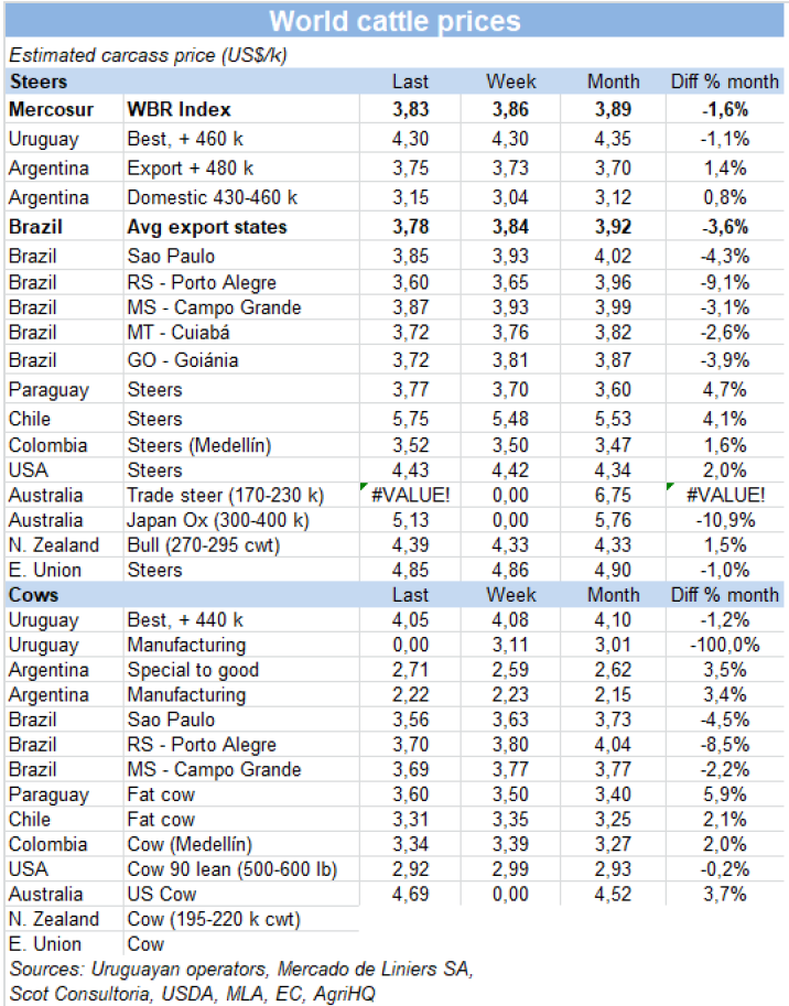 南方共同市場閹牛價(jià)格指數(shù)連續(xù)第二周上漲,本周下降了3美分至3.83美元/公斤。巴西牛價(jià)疲軟下跌,烏拉圭牛價(jià)穩(wěn)定,阿根廷和巴拉圭牛價(jià)穩(wěn)中有漲。