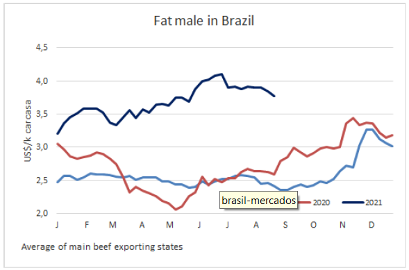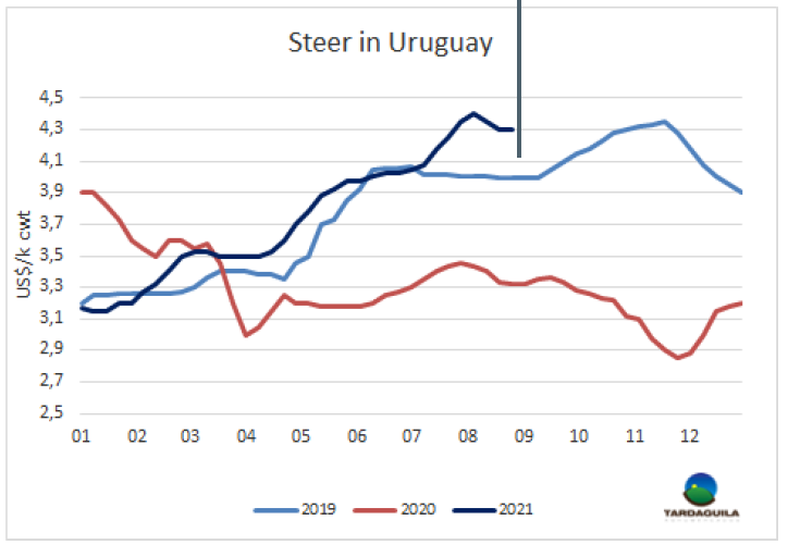 育肥牛市場保持下行趨勢,或?qū)⒊掷m(xù)數(shù)周。據(jù)被問詢的市場參與者反映,大多數(shù)工廠備貨充足,期貨采購時(shí)間拉長,有些工廠甚至開始買九月前10天的牛。這種情況下工廠壓價(jià)幾美分,只要生產(chǎn)者可以接受,價(jià)格會(huì)繼續(xù)下跌。本周用于出口的特種閹牛參考價(jià)4.3美元/公斤,國內(nèi)市場的閹牛參考價(jià)4.25美元/公斤,肉母牛4.05-4.15美元/公斤,牛供應(yīng)量仍很少,預(yù)計(jì)15天之后隨著天氣變化和烏拉圭南部的降雨來臨活牛供應(yīng)將增加。
