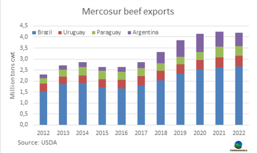 預(yù)計(jì)2022年南美牛肉出口量略有下降