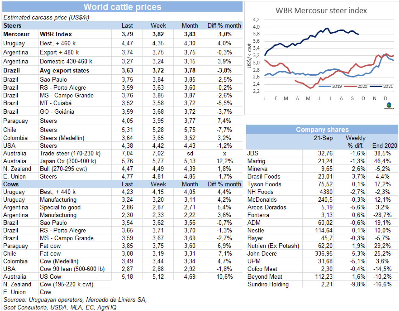 上周三的停工對(duì)肉類(lèi)加工業(yè)的活動(dòng)產(chǎn)生了影響。INAC報(bào)告稱(chēng),在截至9月18日的一周內(nèi),牛屠宰量47168頭,比前一周少7409頭,是自8月1日以來(lái)的最小數(shù)量。不過(guò)仍然遠(yuǎn)遠(yuǎn)高于去年這個(gè)時(shí)候的35000頭。大多數(shù)屠宰場(chǎng)周三沒(méi)有屠宰,在目前的情況下,盡管一周其余幾天的屠宰增加,無(wú)法抵消周三屠宰量的缺口。本周閹牛屠宰量23,662頭(較上周-15%),母牛16,674頭(較上周-15%),小母牛6,134頭(較上周-4%)。屠宰量領(lǐng)先的工廠是Las Piedras(4508頭),美麗華的Pulsa(4475頭)和Canelones(3834頭)。美麗華三個(gè)工廠屠宰量12025頭,較上周減少了1195頭,而Marfrig三個(gè)工廠屠宰了8806頭牛,較上周減少了1928頭。9月前18天,牛屠宰量137683頭,比2020年同期增加了49%。