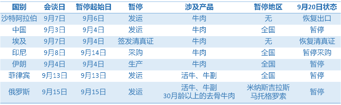 下表匯總了一些國(guó)家及地區(qū)對(duì)巴西牛肉進(jìn)口采取的限制措施。