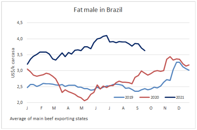 巴西育肥牛價(jià)格下跌繼續(xù)拉低南美市場(chǎng)閹牛價(jià)格指數(shù)。本周南方共同市場(chǎng)閹牛價(jià)格指數(shù)下跌3美分至3.79美元/公斤,達(dá)五月末以來(lái)最低。中國(guó)暫停進(jìn)口巴西牛肉這一決策繼續(xù)延長(zhǎng)的事實(shí)給本周育肥牛價(jià)格價(jià)格帶來(lái)了5雷亞爾/15公斤的下行壓力。由于中國(guó)房地產(chǎn)市場(chǎng)危機(jī)對(duì)新興國(guó)家貨幣的影響,美元價(jià)格的跌幅更大。育肥牛美元價(jià)格下跌了9美分至3.63美元/公斤。阿根廷出口閹牛的價(jià)格穩(wěn)定在3.75美元/公斤。巴拉圭和烏拉圭的價(jià)格在一周內(nèi)上漲了約10美分。巴拉圭育肥公牛價(jià)格4.05美元/公斤,烏拉圭育肥公牛價(jià)格達(dá)4.45-4.50美元/公斤,創(chuàng)最高紀(jì)錄。
