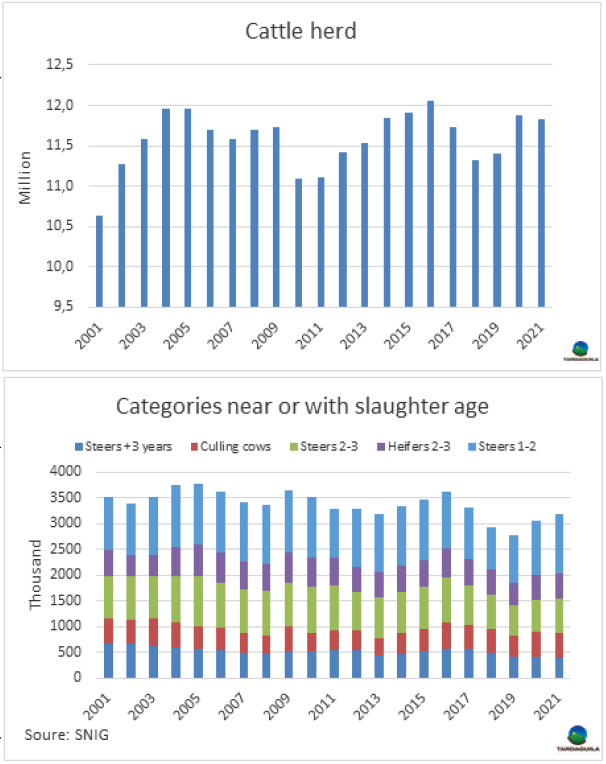 考慮到牛存欄量和畜產(chǎn)面積,每公頃牛存欄量從去年的0.73個(gè)減少到今年的0.72個(gè)。低于過(guò)去10年的平均水平(0.735)。因此,如果從氣候的角度來(lái)看,這一年沒(méi)有重大的氣象災(zāi)害,那么在牧草供應(yīng)方面就應(yīng)該沒(méi)有重大的損失。然而有警告稱(chēng),今年是拉尼娜年份,這意味著降雨低于正常水平的可能性更大,主要是在11月至1月期間。