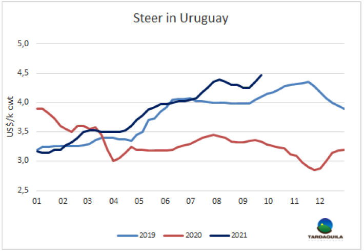 育肥閹牛的價(jià)格持續(xù)飆升,創(chuàng)新紀(jì)錄。特種閹牛價(jià)格4.45美元-4.50美元/公斤不含運(yùn)費(fèi),45天付款。這一價(jià)格超過(guò)了此前在今年8月初達(dá)到的最高水平,超過(guò)2019年11月初的水平。較年初的價(jià)格增長(zhǎng)了1.30美元/公斤,增長(zhǎng)了41%。供應(yīng)仍然是稀缺的。預(yù)訂時(shí)間縮短至7-10天,一些中型工廠仍在預(yù)訂本周的牛。重型母牛參考價(jià)4.25-4.2美元/公斤,國(guó)內(nèi)市場(chǎng)補(bǔ)欄用的輕型母牛仍然很少,小母牛4.2-4.3美元/公斤。烏拉圭美麗華3廠將在今天完成最后的屠宰,然后開(kāi)始給員工放假。原定于本月初暫停屠宰,后來(lái)推遲到中國(guó)暫停進(jìn)口巴西牛肉后。Marfrig的12廠將從下周二開(kāi)始恢復(fù)屠宰,該公司在該國(guó)的四個(gè)工廠將繼續(xù)進(jìn)行屠宰。烏拉圭的春季氣候不錯(cuò),陽(yáng)光明媚,土壤水分充足。農(nóng)民要做出選擇是繼續(xù)在他們的土地上增加廉價(jià)的瘦牛,還是隨著牧草供應(yīng)的改善而上升之前賣(mài)掉他們以購(gòu)買(mǎi)架子牛。預(yù)計(jì)市場(chǎng)將保持堅(jiān)挺。