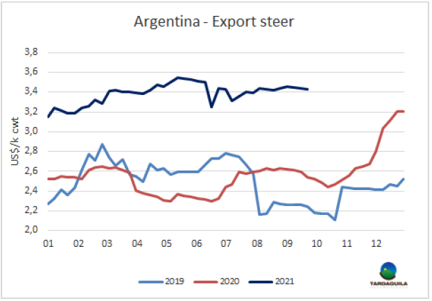 8月閹牛類(lèi)型價(jià)值再次增長(zhǎng),達(dá)2019年12月以來(lái)的最高水平,而閹牛采購(gòu)價(jià)格隨著待宰牛價(jià)格上漲而大幅上漲至2007年以來(lái)最高。8月每頭牛的價(jià)值為1308美元,較上月增加35美元。INAC表示,這一趨勢(shì)是由于“出口價(jià)值價(jià)格、國(guó)內(nèi)市場(chǎng)胴體價(jià)格以及生皮價(jià)格”的上漲。另一方面,內(nèi)臟和副產(chǎn)品的價(jià)格則有所下降。閹牛采購(gòu)價(jià)格漲幅比所有產(chǎn)品的價(jià)格漲幅更大導(dǎo)致INAC所說(shuō)的工業(yè)增加值下降——兩者的差,工廠仍要面臨其它成本,最終保持利潤(rùn)率。今年8月工業(yè)增加值僅為137美元,是自2010年9月(近11年前)以來(lái)的最低水平。工業(yè)增加值僅為閹牛價(jià)值的10.5%,達(dá)最低水平。人們認(rèn)為,如果比例低于20%,屠宰場(chǎng)將面臨虧損。