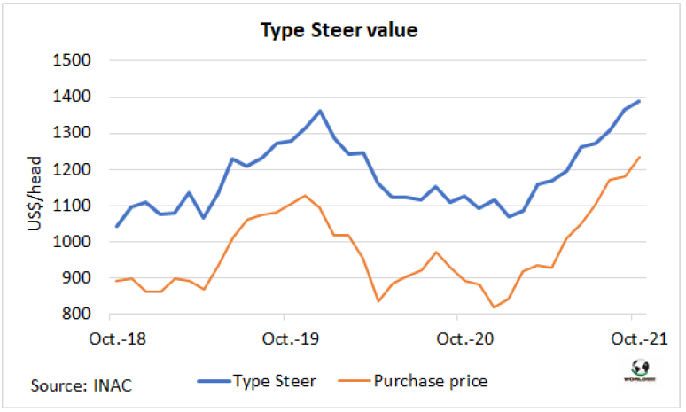閹牛類(lèi)型價(jià)值,是對(duì)牛肉工廠出售牛分割出的所有產(chǎn)品價(jià)格的加權(quán)估算,10月閹牛類(lèi)型價(jià)值達(dá)歷史新高。據(jù)INAC的報(bào)告,閹牛類(lèi)型價(jià)值平均1389美元,比9月增加了22美元,比去年同期增加了261美元(23%)。INAC稱(chēng)這是因?yàn)椤俺隹诓课蝗夂蛧?guó)內(nèi)市場(chǎng)胴體價(jià)格的上漲”。相反,鮮皮、內(nèi)臟和副產(chǎn)品價(jià)值下降。相反,10月活牛采購(gòu)價(jià)上漲了53美元/頭至1233美元/頭?;钆2少?gòu)價(jià)與閹牛類(lèi)型價(jià)值之間的差額(INAC稱(chēng)之為工業(yè)增加值)本月減少了31美元至156美元,僅為閹牛類(lèi)型價(jià)值的11.2%。