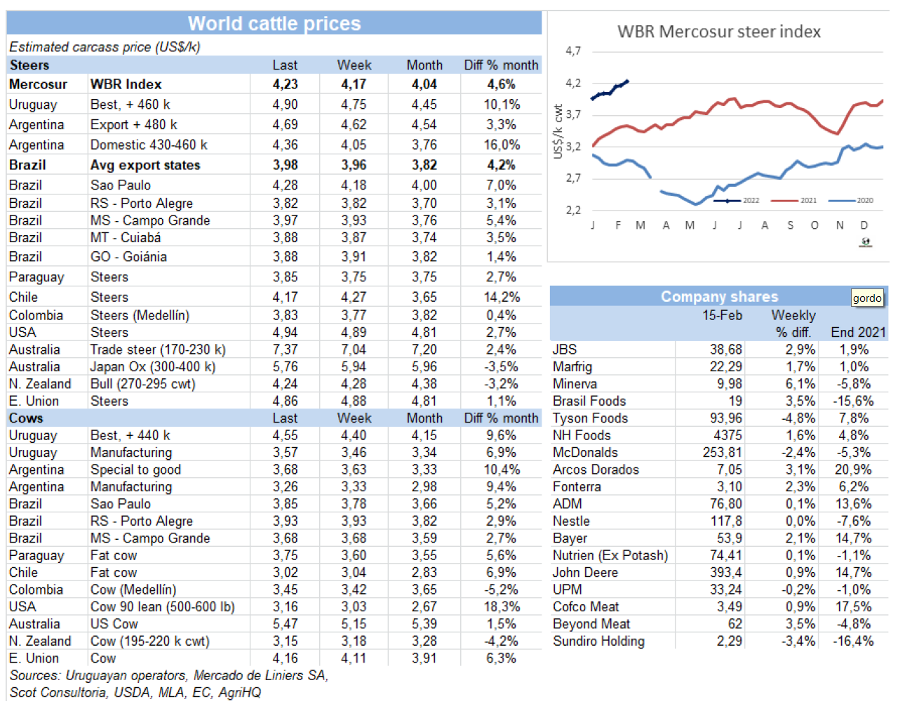 上周牛屠宰量保持高水平。烏拉圭肉協(xié)報(bào)道截止2月12日當(dāng)周牛屠宰量53653頭,較上周下降了300頭,同比去年同期增長了26%。閹牛屠宰量30058頭,較上周增長了10%,小母牛屠宰量急劇下降了31%至5818頭,母牛屠宰量16886頭,較上周下降了2%。屠宰活動(dòng)最活躍的工廠是Las Piedras(379廠),屠宰量5,338頭, Ontilcor (439廠)屠宰量4,109頭, 其次是Marfrig-Tacuarembó(12廠) 屠宰量3,851頭。Marfrig四家屠宰廠屠宰量13602頭,較上周增長了725頭,美麗華三家屠宰場屠宰量9785頭,較上周下降了1022頭。2月前12天牛屠宰量共計(jì)98015頭,較2021年同期增加了2.1萬頭,增幅為21%。