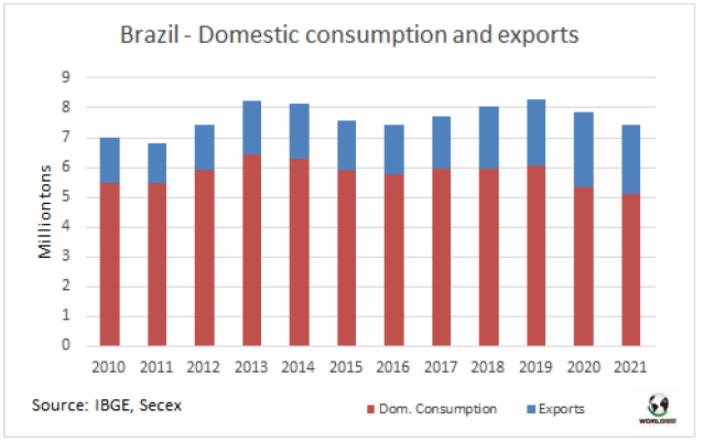 2021年巴西牛肉產(chǎn)量的減少對(duì)出口和國內(nèi)消費(fèi)均產(chǎn)生影響。據(jù)估計(jì),巴西去年人均牛肉消費(fèi)量509萬噸(胴體重量),比2020年減少了27萬噸(-5.1%),是自2009年以來的最低水平。這一數(shù)字是基于IBGE發(fā)布的生產(chǎn)數(shù)據(jù)和外貿(mào)部的對(duì)外貿(mào)易數(shù)據(jù)報(bào)告。相反,如果考慮到人口的變化,檢驗(yàn)機(jī)構(gòu)注冊(cè)的合規(guī)屠宰場(聯(lián)邦、州或市)生產(chǎn)的牛肉的人均消費(fèi)量是自2004年以來首次降至24公斤以下。由于暫停對(duì)中國出口,今年最后一個(gè)季度的出口量急劇下降,這意味著海外銷售較去年的下降比例要大于國內(nèi)市場。出口量減少了7.0%至234萬噸,同比減少18萬噸(胴體重量)?!?span>