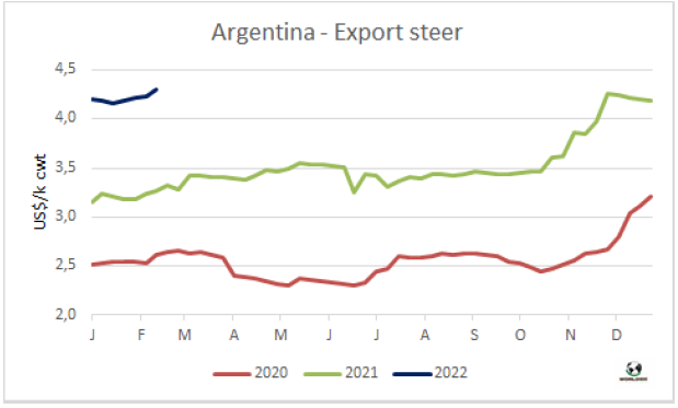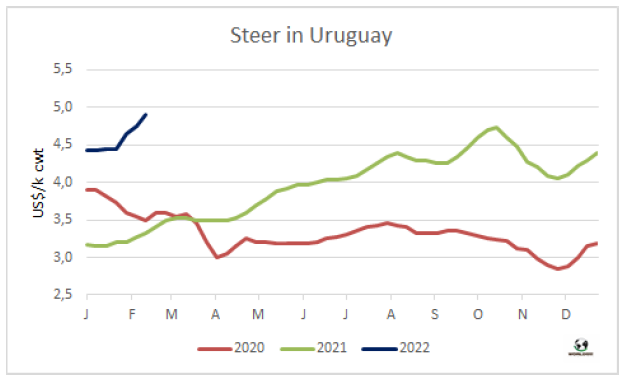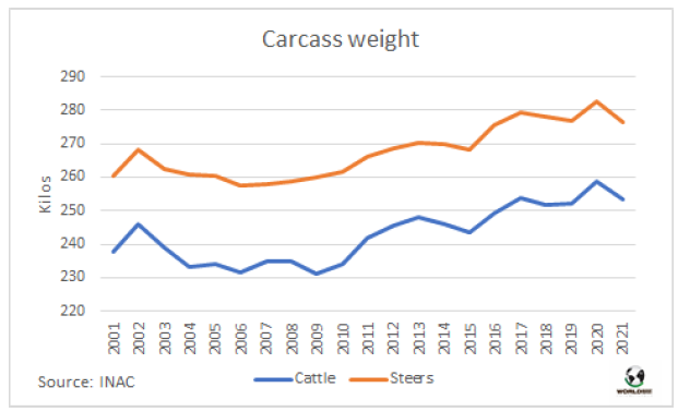 根據(jù)ABC出口商會(huì)的一份報(bào)告,去年待宰牛平均體重有所增加:母牛平均胴體重量為每頭210公斤,公牛的平均胴體重量為每頭246公斤,均高于2020年數(shù)據(jù)。對(duì)于ABC來說,由于“穆尼屠宰量減少和較輕動(dòng)物數(shù)量減少”,平均體重為每頭228公斤,比2020年增長了2公斤。2022年的第一個(gè)月,這一數(shù)值再次被超越,達(dá)229公斤,盡管報(bào)告稱這 “與我們的競爭對(duì)手相比仍有很大差距”。