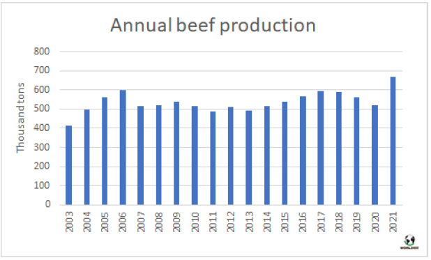 2021年創(chuàng)紀(jì)錄的牛屠宰量決定了牛肉產(chǎn)量大幅增長,達(dá)66.8萬噸,創(chuàng)歷史最高紀(jì)錄,同比增幅為28.7%。牛肉產(chǎn)量比2006年的最高紀(jì)錄高出6.9萬噸。牛屠宰量較2006年增加了不到5萬頭,增幅為1.9%,胴體重量增加了21.8公斤增幅約9.4%,因此牛肉產(chǎn)量比之前的記錄高出了11.5%。