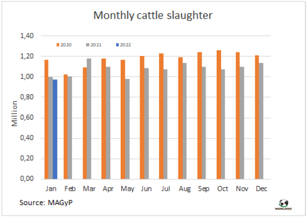 1月阿根廷牛屠宰量約97.2萬頭,較上月下降了14%,較去年1月下降了3%。2021年五月牛肉出口因罷工被禁時(shí)的屠宰量沒有低于上月。2021年2月至2022年1月牛屠宰量達(dá)1284萬頭,同比下降了7%,母牛的比例為45%。