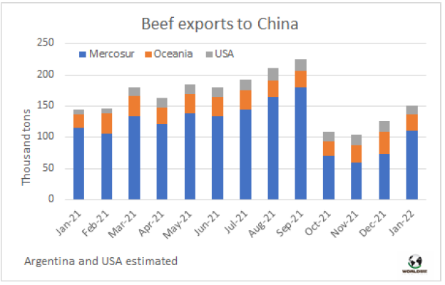 隨著2月中旬中國市場對(duì)巴西牛肉解禁,巴西對(duì)中國牛肉出口量穩(wěn)步增長。據(jù)估計(jì),今年1月,南美洲、大洋洲和美國向中國出口了約15萬噸牛肉,比去年12月多出了約2.5萬噸,比去年11月多出了近5萬噸,而當(dāng)時(shí)巴西的牛肉供應(yīng)量幾乎為零。今年1月從南美市場發(fā)運(yùn)的貨物約為11萬噸,由于巴西的重新回歸,較上月增加了3.7萬噸。澳大利亞和新西蘭1月的出口總量為25761噸,比去年12月的季節(jié)性高峰減少了9500噸。2月,對(duì)中國的出口量將繼續(xù)增長,接近2021年8月和9月達(dá)到的每月20多萬噸的峰值。