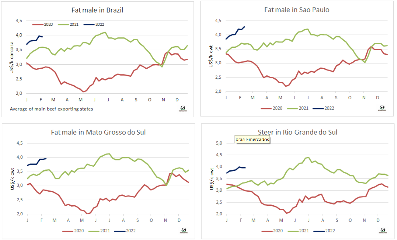2月前兩周巴西牛肉出口量以驚人的速度增長,價(jià)格也穩(wěn)步上漲。外貿(mào)部報(bào)告顯示,2月的前9個(gè)工作日出口量73446噸,FOB平均價(jià)格5504美元/噸。平均每天的出貨量為8161噸,因此如果保持這個(gè)速度,2月的出貨量將超過15萬噸,比2021年同月高出50%以上。