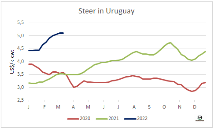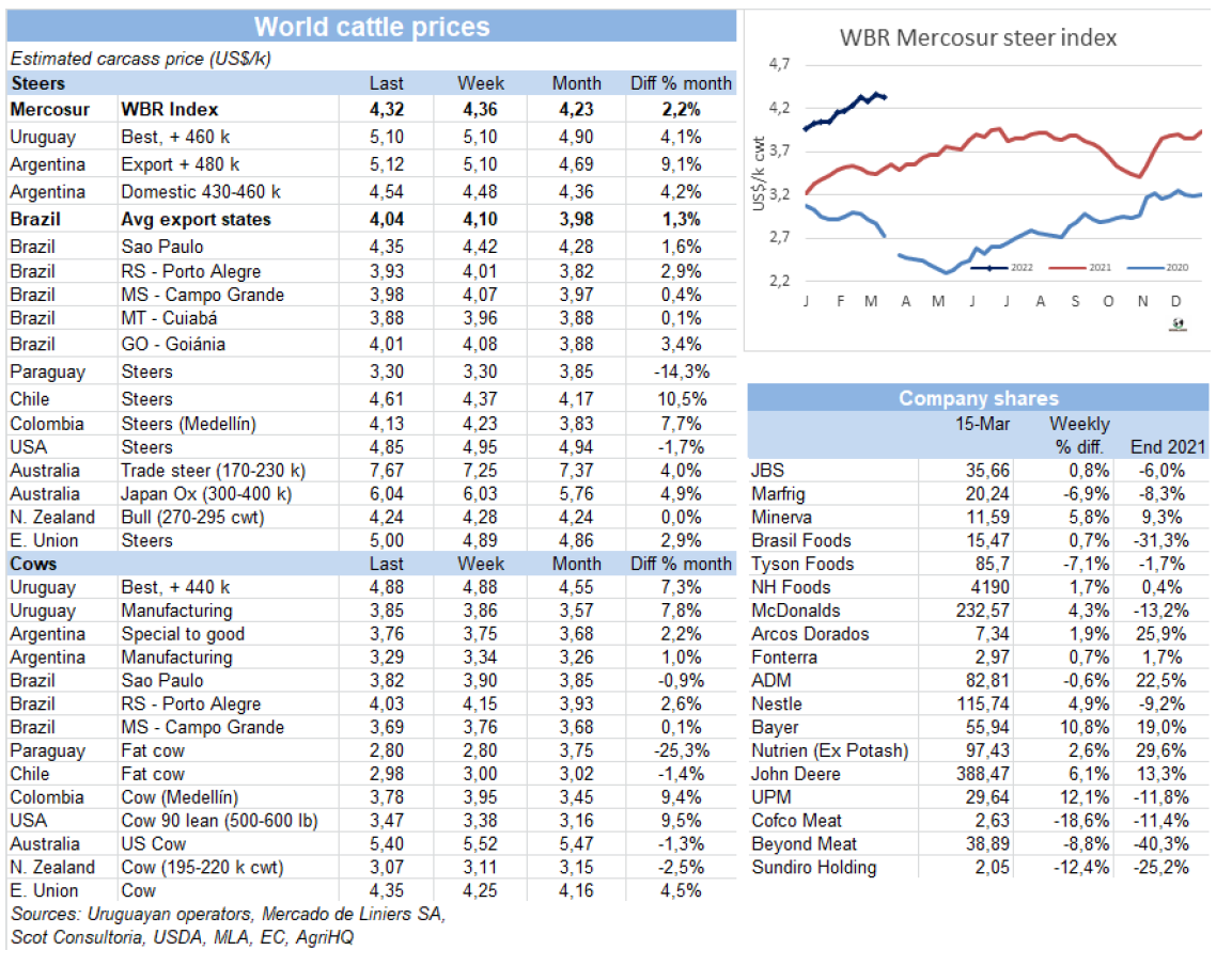 上周屠宰量受到24小時(shí)罷工影響。烏拉圭肉協(xié)統(tǒng)計(jì)截止3月12日當(dāng)周牛屠宰量51784頭,盡管屠宰量仍高于五萬頭,但較上周有10%的降幅,是今年以來首次屠宰量同比下降。閹牛屠宰量下降最為顯著,較上周下降了3715頭至25258頭。小母牛屠宰量下降了1645頭至5908頭,母牛屠宰量?jī)H較上周下降了692頭至19327頭。屠宰活動(dòng)最活躍的工廠是Las Piedras(379廠),屠宰量4894頭,Minerva Pulsa(7廠) 屠宰量3925頭, 其次是Minerva Canelones(8廠)屠宰量3892頭。Marfrig四家屠宰廠屠宰量12424頭,較上周下降了2920頭,美麗華三家屠宰場(chǎng)屠宰量11237頭,較上周減少了288頭。3月前12個(gè)工作日牛屠宰量共計(jì)99980頭,較2021年同期減少了0.4%,主要是閹牛屠宰量減少了5.3%,小母牛屠宰量減少了11.2%,母牛屠宰量增加了10.2%,閹牛中只有2-4顆齒閹牛屠宰量增長(zhǎng)了7.1%。