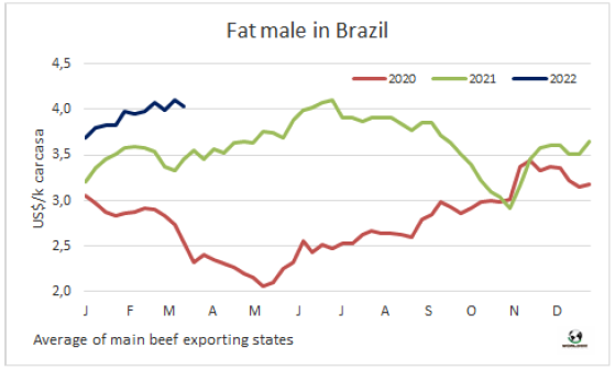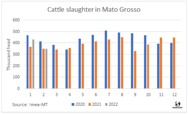 馬托格羅索州是巴西存欄最大的州,2月牛屠宰量和1月相比下降了8.2萬頭(-19%),同比也下降了 3000頭,屠宰量連續(xù)三個(gè)月的增長(zhǎng)結(jié)束。Agrifatto稱,屠宰量下降的主要原因是公牛屠宰量較1月份下降了26.6%,只有18.36萬頭,是35個(gè)月來最低。該咨詢公司推測(cè),屠宰量下降可能由于去年9月對(duì)中國出口暫停以及2021年最后一個(gè)季度待宰牛價(jià)格下降導(dǎo)致育肥進(jìn)程減緩。母牛屠宰量較上月減少8.6%,為16.47萬頭,母牛屠宰量在中占比增加到47.3%,為24個(gè)月來的最高水平。然而這些數(shù)據(jù)本身并不意味著今年待宰牛供應(yīng)增長(zhǎng)趨勢(shì)的逆轉(zhuǎn)。
