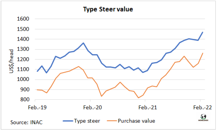 INAC把一頭體重480公斤,出成率54%的牛的銷售價(jià)值成為閹牛類型價(jià)值,2月該指數(shù)達(dá)到了歷史新高1470美元,較上月增加81美元。INAC表示,環(huán)比的增長(zhǎng)是由于“出口部位肉和到國內(nèi)市場(chǎng)的東西銷售價(jià)值增長(zhǎng),部分抵消了內(nèi)臟和副產(chǎn)品價(jià)值的下降,而鮮皮的價(jià)格保持穩(wěn)定。”本月活牛采購價(jià)格上漲了105美元,達(dá)1264美元,因此工業(yè)增加值(兩者之間的差額)收縮至206美元/頭,僅為閹牛類型價(jià)值的14%。