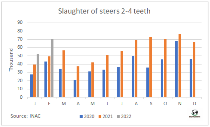 據(jù)農(nóng)業(yè)部估算,今年2月阿根廷牛肉產(chǎn)量23.2萬噸,2022年前兩個(gè)月產(chǎn)量合計(jì)45.4萬噸。單月看有所差異,但1-2月合計(jì)牛肉生產(chǎn)量與去年同期持平。2月人均消費(fèi)量51公斤,1-月人均消費(fèi)量48公斤,比2021年同期增長(zhǎng)8%。