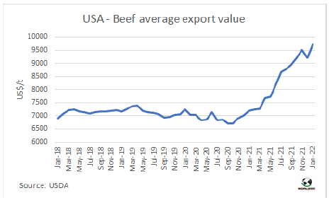 巴西牛肉出口繼續(xù)以驚人的速度增長(zhǎng)。3月前8個(gè)工作日出口量84215噸,平均離岸價(jià)5848美元/噸。日均出口量10527噸,創(chuàng)歷史新高,平均出口價(jià)格也遠(yuǎn)遠(yuǎn)超過了去年9月5790美元/噸的歷史最高紀(jì)錄。如果本月剩余時(shí)間保持這一速度,巴西3月份出口量將達(dá)約23萬噸。此前的最高月度紀(jì)錄是在去年9月,當(dāng)時(shí)出口量達(dá)18.7萬噸。