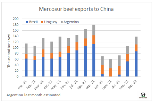 今年2月,南方共同市場(chǎng)國家向中國出口了近14萬噸的牛肉,環(huán)比增加3.4萬噸,同比也有所增加,這是自去年9月以來從未出現(xiàn)過的情況。這一增長(zhǎng)是由于來自巴西的銷售強(qiáng)勁擴(kuò)張,在12月15日重新開放后,巴西已經(jīng)恢復(fù)了發(fā)貨速度。巴西2月的出口量為8.7萬噸(比1月份多3.4萬噸),而烏拉圭的出口量仍在2.5萬噸左右。據(jù)估計(jì),阿根廷的出口量在2.7萬噸上下擺動(dòng),與1月的出口量相當(dāng)。2月從南方共同市場(chǎng)運(yùn)出的這些貨物將在3月中旬至4月下半月抵達(dá)目的地。南方共同市場(chǎng)占中國進(jìn)口牛肉供應(yīng)的75%。今年2月從澳洲進(jìn)口量27,265噸 (新西蘭15,734噸,澳大利亞11,531噸)。另一個(gè)重要的供應(yīng)國是美國,1月美國出貨量為16156噸,目前還沒有2月的數(shù)據(jù)。