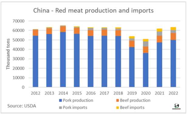 今年中國紅肉的生產(chǎn)和進(jìn)口將達(dá)到非洲豬瘟(ASF)疫情之前的水平,非洲豬瘟從2018年下半年開始摧毀了中國的生豬存欄。根據(jù)美國農(nóng)業(yè)部駐北京辦公室發(fā)布的預(yù)測(cè),今年豬肉和牛肉的生產(chǎn)和進(jìn)口總額將達(dá)到6355萬噸,比2021年多170萬噸,與豬瘟出現(xiàn)之前的2016-2017年水平相似。美國農(nóng)業(yè)部辦公室預(yù)計(jì),今年的豬肉產(chǎn)量將增加250萬噸,達(dá)到5,000萬噸。就中國而言,豬肉進(jìn)口每年將大幅下降24%至330萬噸;無論如何,這一產(chǎn)量是2017年和2018年的兩倍多,當(dāng)時(shí)的產(chǎn)量為150萬噸。豬肉進(jìn)口量下降是由于豬肉產(chǎn)品的國內(nèi)價(jià)格下降,考慮到今年中國經(jīng)濟(jì)適度增長(zhǎng),進(jìn)口關(guān)稅提高至12%。牛肉方面,國內(nèi)產(chǎn)量預(yù)計(jì)增長(zhǎng)2.4%,達(dá)到715萬噸,進(jìn)口量將溫和增長(zhǎng)2.5%(遠(yuǎn)低于往年),相當(dāng)于7.6萬噸胴體重,達(dá)310萬噸。美國農(nóng)業(yè)部此前的預(yù)測(cè)是,今年中國牛肉進(jìn)口量為325萬噸。