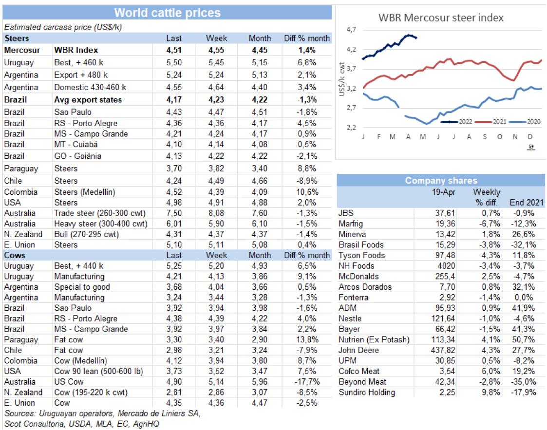 美麗華預(yù)計(jì)2022年下半年(尤其是2023年) 巴西的牛供應(yīng)量將增加,這將為加工廠帶來更大的利潤率,而2023年的峰值周期利潤率與之前相比可能更高。此外,巴西國內(nèi)消費(fèi)疲軟可能會(huì)限制牛價(jià)上漲(盡管美麗華預(yù)計(jì)2022年不會(huì)進(jìn)一步下跌)。根據(jù)桑坦德銀行巴西分行的報(bào)告,即使不像巴西那樣處于上升趨勢,由于哥倫比亞、巴拉圭和烏拉圭一段時(shí)間內(nèi)持續(xù)的積極勢頭以及阿根廷到2022年的良好周期,美麗華海外市場的前景仍然穩(wěn)固。
