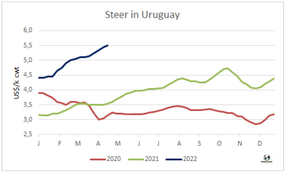 2022年第一季度,活牛出口僅5000頭,達(dá)2012年以來最低水平。但考慮到中國和土耳其這兩個(gè)主要的進(jìn)口國采購興趣增長,行業(yè)普遍預(yù)計(jì)貿(mào)易流在接下來幾個(gè)月有所好轉(zhuǎn)?;钆YQ(mào)易少的主要原因不是缺乏需求,而是受育肥牛價(jià)格高的拉動(dòng),國內(nèi)市場出價(jià)較高。出口土耳其市場的知情人士稱正在采購未來船期的訂單,采購興趣主要集中在280公斤以下的乳齒閹牛,成交價(jià)2.8美元/公斤。土耳其方面,2020年宣布的從今年開始停止進(jìn)口育肥用活牛的計(jì)劃被擱置。美國農(nóng)業(yè)部駐安卡拉辦事處預(yù)計(jì),由于飼養(yǎng)場牲畜短缺,今年進(jìn)口牲畜的數(shù)量將增加30%,達(dá)34萬頭。對中國的出口需求也再次顯現(xiàn)。今年4月,海關(guān)報(bào)告了7000頭母牛的需求,5月同樣有7000頭肉母牛和乳母牛的需求即將發(fā)運(yùn)。市場參與者反映,每頭懷孕小母牛的出口收入高達(dá)800美元,每頭重達(dá)250公斤的小母牛的出口收入高達(dá)550美元。過去12個(gè)月里,烏拉圭出口了約20萬頭活牛,較2021年底的26萬頭相比大幅下降??紤]到采購方興趣改善的預(yù)期,未來幾個(gè)月跌勢將有所減弱或趨于穩(wěn)定。