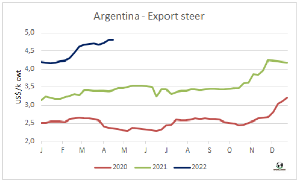 在供應(yīng)短缺和通貨膨脹的推動(dòng)下,出口閹牛價(jià)格經(jīng)歷了一次新的上調(diào)。上周牛價(jià)上漲了5-20比索/公斤,今年以來累計(jì)上漲了25%。質(zhì)量最好的英國純種閹牛價(jià)格在540-550比索之間,澤布雜交品種的價(jià)格上漲到510-530比索/公斤,今年迄今為止上漲了21%。特優(yōu)母牛價(jià)格上漲了5比索至465-485比索/公斤。主要賣到中國市場的工業(yè)母?,F(xiàn)在的價(jià)格約為400-435比索/公斤。